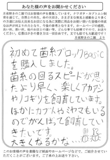 青森県 髙坂 様 Basic X Facebook はてブ LINE Pinterest コピー 2022.10.082025.12.16 初めて菌糸ブロックBasicを購入しました。菌糸の回るスピードが思ったより早く、楽しくアカアシやノコギリを飼育しています。ほかにカブトやミヤマもいるのでがんばって飼育していきたいです。大きくなるかな…
