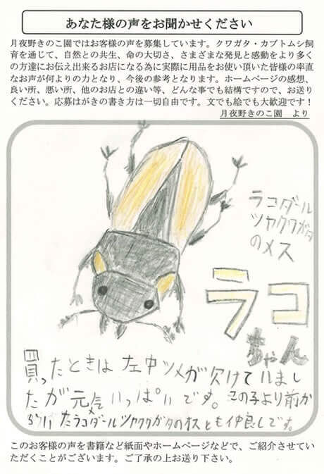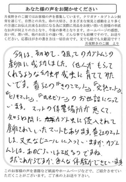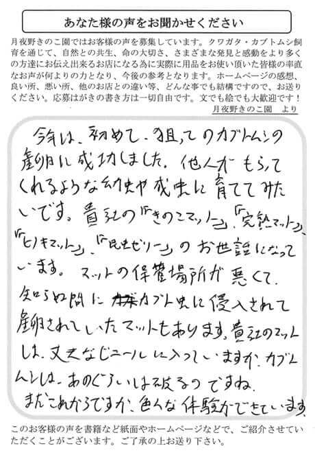 今年は、初めて狙ってのカブトムシの産卵に成功しました。他人がもらってくれるような幼虫や成虫に育ててみたいです。貴社の『きのこマット』『完熟マット』『ヒノキマット』『昆虫ゼリー』のお世話になっています。マットの保管場所が悪くて、知らぬ間にカブト虫に侵入されて産卵されていたマットもあります。貴社のマットは、丈夫なビニールに入っていますが、カブトムシは、あのぐらいは破るのですね。まだこれからですが、色々な体験ができています。