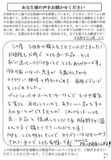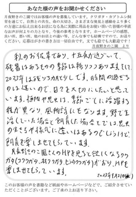 秋のお彼岸であり、十五夜が近づいて残暑はあるものの季節は移りつつあります。そして2023年は残り3ヶ月と少しです。時間の過ぎるには速いので、日々を大切にしたいと思っています。植物や昆虫は、季節ごとに活躍する種が異なり、風物詩にもなります。野で生活していた場合と飼育した場合とでは、昆虫の生き方や様式に違いはあるのでしょうけど、飼育を楽しませてもらっています。月夜野きのこ園さんのHPを見ると欲しくなるクワガタ(コクワガタ・オオクワガタ・ヒラタクワガタ)がおり、HPを楽しませてもらっています。