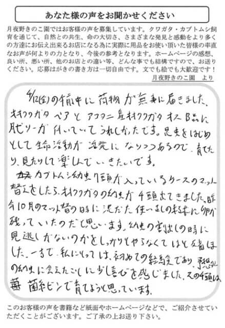 4/12(金)の午前中に荷物が無事に届きました。オオクワガタペアとアコタニ産オオクワガタオスB品に月ゼリーが付いていてうれしかったです。昆虫をはじめとして生命活動が活発になりつつあるので、育てたり、見たりして楽しんで行きたいです。カブトムシ幼虫7頭が入っているケースのマット替えをしたらオオクワガタの幼虫が4頭出てきました。昨年10月のマット替の時に混だた使い古しの材木に卵が残っていたのだと思います。幼虫の割出しの時に見逃しがないのかをしっかりとやらなくてはと反省しました。一方で、私にとっては初めての経験であり、予想外の幼虫に会えたことに少し喜びを感じました。その4頭は菌糸ビンで育てようと思っています。