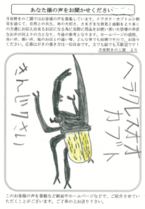 7日の立秋が近づいて、ツクツクボウシの声も聞くようになり、秋が見えてきた感じです。しかし、暑さはまだまだ続きますね。この前、私の住む浜松は、5日連続で最高気温が38℃まで上がりました。しかし、湿度が低くて風も吹いて、ドライな暑さでしたカブトムシやクワガタムシが暑さで弱まるのではないかと心配しましたが、風と湿度の低下で助かったと思います。セミ・カエル・トンボ・チョウ・鳥は元気でした。蚊とアリは暑さで目立たなくなっていました。自分達も工夫して暑い中でも楽しんでいきたいです。