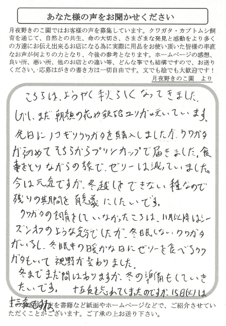 こちらは、ようやく秋らしくなってきました。しかし、まだ朝顔の花や鉄砲ユリが咲いています。先日にノコギリクワガタを購入しましたが、クワガタが初めてそちらからプリンカップで届きました。食事をとりながらの旅でゼリーは減っていました。今は元気ですが、冬越しをできない種なので残りの期間を有意義にしたいです。クワガタの飼育をしていなかったころは、11月以降はシーズンオフのような気分でしたが、冬眠しないクワガタがいるし、冬眠中の暖かな日にゼリーを食べるクワガタもいて視野が変わりました。冬までまだ間はありますが、冬の準備もしていきたいです。