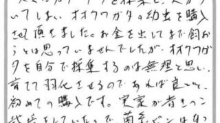 こんにちは。こちらは、西寄りの冬の季節風が吹くようになり、紅葉も進み始めています。一方でまだ活動しているカエルがいます。貴社から10月初めに購入したノコギリクワガタの雄と11月中ばに購入したノコギリクワガタの雄雌が元気に活動しています。ノコギリクワガタさんには寒い時季ですが、しっかりとお世話をしたいです。11/10は松本市でフルマラソンに出て走ったというのか歩いたというのか、5.30ぐらいでフィニッシュしました。その1週間後に豊川市で10kmマラソンに出ました。違う地域に行くのもいいですね。松本市では初めて実が付いている状態のリンゴの木を見ました。自分の体のケアもしっかりとしたいです。年の瀬ですが、体に気をつけてやっていきましょう。