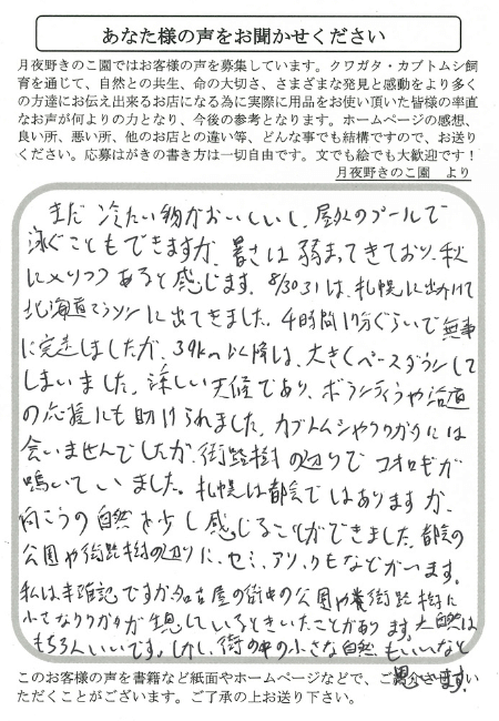 残暑はありますが、少しずつ秋色が増していきます。今年の十五夜は10/6(月)のようですが、秋の月はパワーを与えてくれそうな気がします。カブトムシ・オオクワガタ・ツシマヒラタクワガタは、まだ元気に活動しています。自分でブリードしたクワガタは、ほとんどが市販のものよりも小さいですが、飼育することを楽しんでいくたいです。身の周りにカブトムシやコクワガタは増えましたが、昆虫は「捕まえる」というより「買う」という発想が私の地域では強いと思います。バッタ・トンボ・スズムシ・コオロギが増えたように近所にヒラタクワガタ・オオクワガタ・ノコギリクワガタが増える未来があってもいいなと思います・。