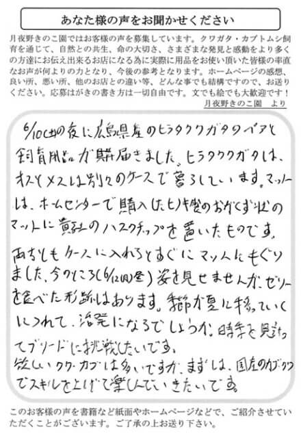 6/10(土)の夜に広島県産のヒラタクワガタペアと飼育用品が届きました。ヒラタクワガタは、オスとメスは別々のケースで暮らしています。マットは、ホームセンターで購入したヒノキ製のおがくず状のマットに貴社のハスクチップを置いたものです。両方ともケースに入れるとすぐにマットにもぐりました。今のところ(6/12月昼)姿を見せませんが、ゼリーを食べた形跡はあります。季節が夏に移っていくにつれて、活発になるでしょうか。時季を見計らってブリードに挑戦したいです。欲しいクワガタは多いですが、まずは国産のカブクワでスキルを上げて楽しんでいきたいです。