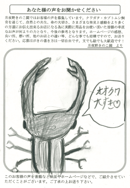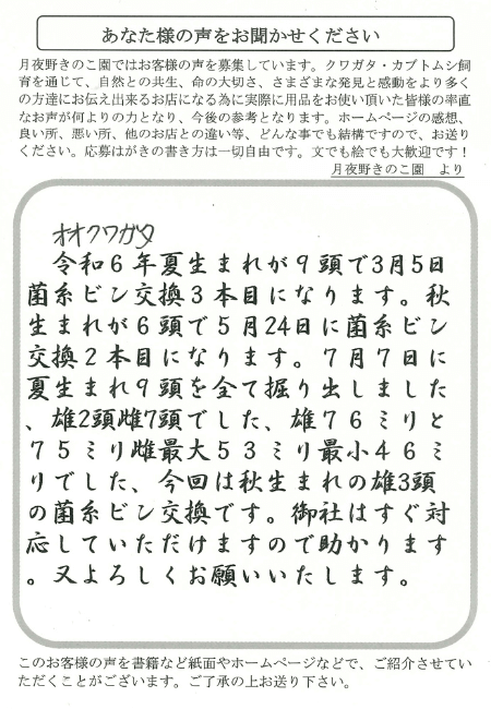 オオクワガタ 令和6年夏生まれが9頭で3月5日菌糸ビン交換3本目になります。秋生まれが6頭で5月24日菌糸ビン交換2本目になります。7月7日に夏生まれ9頭を全て掘り出しました、雄2頭雌7頭でした、雄76ミリと75ミリ雌最大53ミリ最小46ミリでした、今回は秋生まれの雄3頭の菌糸ビン交換です。御社はすぐ対応していただけますので助かります。又よろしくお願いいたします。