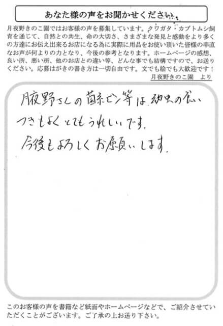 静岡県 平岡 様 菌糸ビン X Facebook はてブ LINE Pinterest コピー 2023.04.052025.12.16 月夜野さんの菌糸ビン等は、幼虫の食いつきもよく、とてもうれしいです。今後ともよろしくお願いします。