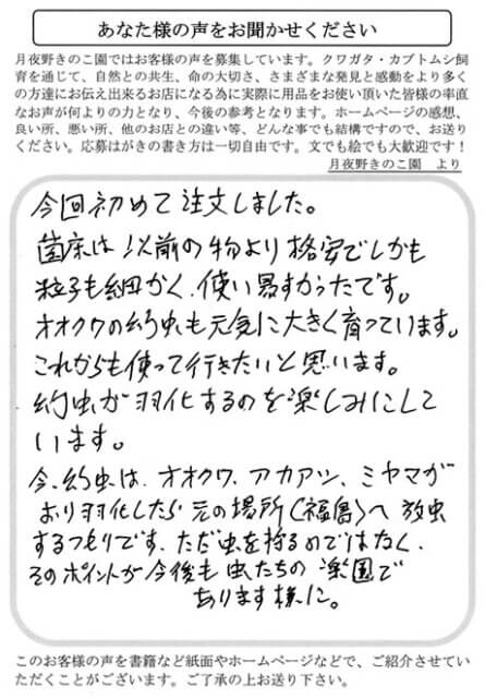 静岡県 星野 様 2025 12/16 飼育用品 60代 2022年5月11日2025年12月16日 今回初めて注文しました。菌糸は以前の物より格安でしかも粒子も細かく、使い易かったです。オオクワの幼虫も元気に大きく育っています。これからも使って行きたいと思います。幼虫が羽化するのを楽しみにしています。 飼育用品 60代 よかったらシェアしてね! URLをコピーしました! URLをコピーしました! 神奈川県 江川 様 熊本県 内山 様 おすすめ記事 てすと投稿です。 2025年12月23日 東京都 澤井 様 2025年12月17日 千葉県 平野 様 2025年12月15日 群馬県 はやしかわ 様 2025年11月21日 群馬県 はやしかわ 様 2025年11月21日 奈良県 栗原 様 2025年11月21日 群馬県 鈴木 様 2025年11月21日 大阪府 ささべ 様 2025年11月21日