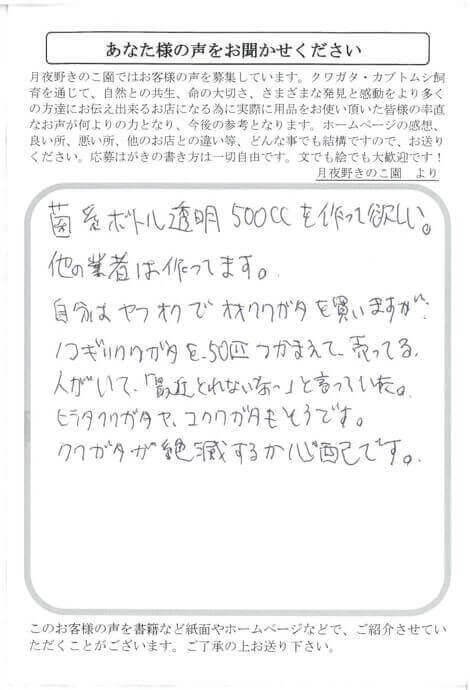 静岡県 栗林 様 40代 X Facebook はてブ LINE Pinterest コピー 2017.10.11 菌糸ボトル透明500ccを作って欲しい。他の業者は作ってます。自分はヤフオクでオオクワガタを買いますがノコギリクワガタを50匹つかまえて売ってる人がいて「最近とれないな~」と言っていた。ヒラタクワガタや、コクワガタもそうです。クワガタが絶滅するか心配です。