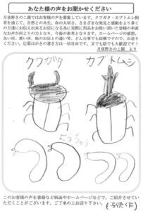 竜洋町の昆虫館でのイベントをきっかけにオオクワガタの幼虫飼育を始めました。2020年に成虫になり、今年2回目の越冬中です。昨年メスをネット購入し、14匹育ててます。菌糸ビンの交換タイミングがいまいちわかってません。3ヶ月程度が目安なのか、食痕を見て適宜なのか、居食いしている個体も多う印象です。ホームページにいろんな方の飼育62録がのって参考になりますが、標準にようなパターンはあるのでしょうか。