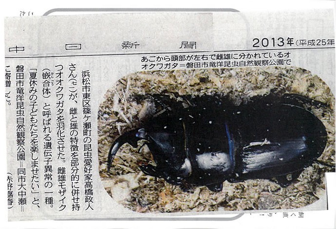 静岡県 高橋 様 写真 X Facebook はてブ LINE Pinterest コピー 2014.06.13 静岡県浜松市東区篠ケ瀬町の昆虫愛好家高橋政人 さん(七一)が、雄と雌の特徴を部分的に併せ持 つオオクワガタを羽化させた。雌雄モザイク (嵌合体)と呼ばれる遺伝子異常の一種。 「夏休みの子どもたちたのしませたい」と、 磐田市竜洋昆虫自然観察公園=同市大中瀬= に寄贈した。