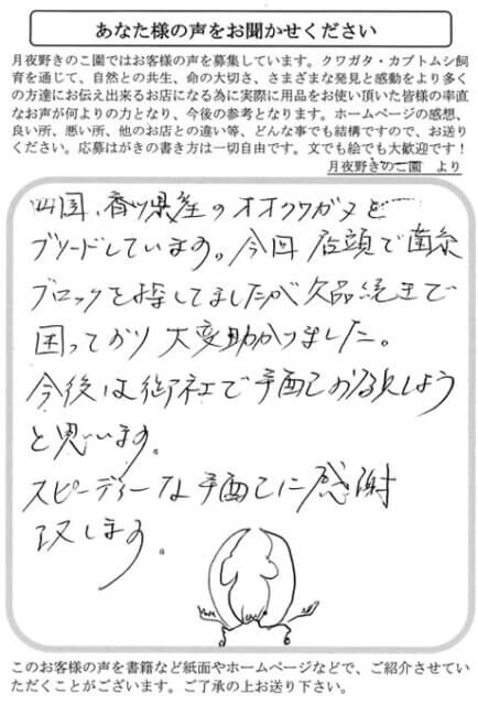 香川県 新 様 発送 X Facebook はてブ LINE Pinterest コピー 2021.12.142025.12.17 四国・香川県産のオオクワガタをブリードしています。今回店頭で菌糸ブロックを探してましたが欠品続きで困っており大変助かりました。今後は御社で手配お願いしようと思います。スピーディーな手配に感謝いたします。