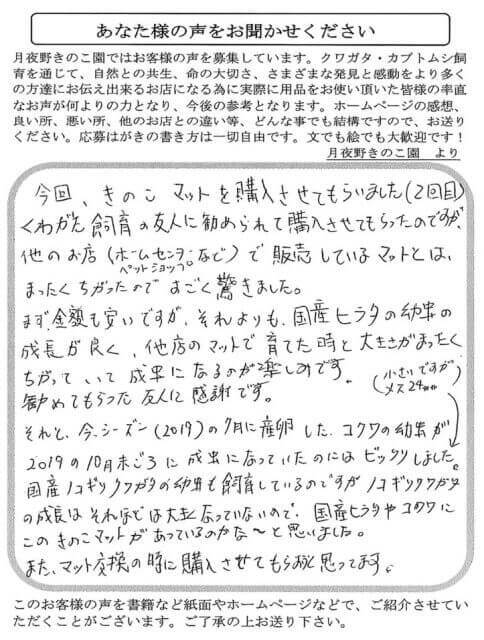 今回、きのこマットを購入させてもらいました。くわがた飼育の友人に勧められて購入させてもらったのですが、他のお店で販売しているマットとは、まったくちがったのですごく驚きました。まず、金額も安いですが、それよりも国産ヒラタの幼虫の成長が良く、他店のマットで育てた時と大きさがまったくちがっていて成虫になるにが楽しみです。今シーズン(2019)の7月に産卵したコクワの幼虫が2019/10月末頃に成虫になっていたのにはビックリしました。国産ノコギリクワガタの幼虫も飼育しているにですが、ノコギリクワガタの成虫はそれほどは大きくなっていないので、国産ヒラタやコクワにこのきのこマットがあっているのかなと思いました。