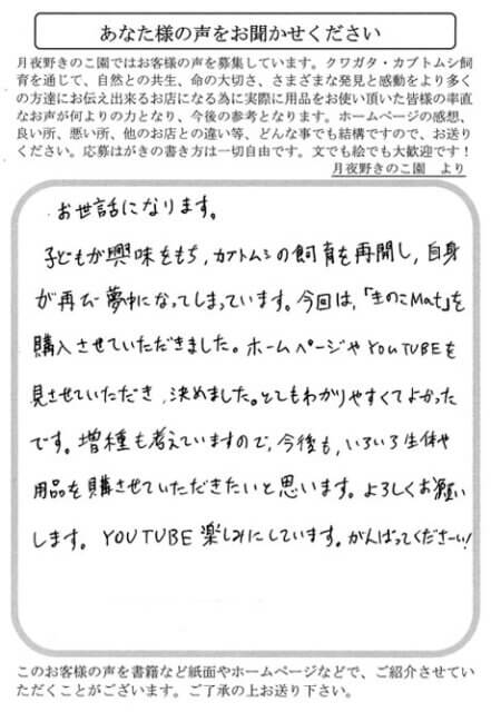 子供が興味をもち、カブトムシの飼育を再開し、自身が再び夢中になってしまっています。今回は、「きのこMat」を購入させていただきました。ホームページやYOUTUBEを見させて頂き、決めました。とてもわかりやすくてよかったです。増種も考えていますので、今後も、いろいろ生体や用品を購入させていただきたいと思います。よろしくお願いします。YOUTUBE楽しみにしています。