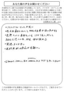 いつもお世話になっております。過去に、オオクワガタの幼虫を6頭や菌糸ビン、飼育マット、コバエシャッターを購入させていただきました。どれも購入させていただいて良かったと思えるものや個体で、とても満足しております。ありがとうございます。今後も継続して貴社からの購入を優先したいと思います。まだ成虫から卵の取り出しがうまく出来ないこともあり、産卵セットや産卵木の販売を拡充してくださると幸いです。今後ともどうぞよろしくお願い致します。