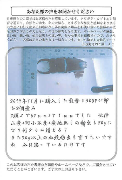 愛知県 増田 様 2018 11/15 生体 60代 2018年11月15日 2017年11月に購入した能勢♀50upが卵を2個産み、2頭♂で64mm・71mmでした。他、津山産・阿古谷産・産地無しの幼虫も20gになり何グラム増える?また30g以上の血統幼虫も育てたいですね。今は思っているだけです。 生体 60代 よかったらシェアしてね! URLをコピーしました! URLをコピーしました! 宮城県 佐々木 様 新潟県 金子 様 おすすめ記事 てすと投稿です。 2025年12月23日 東京都 澤井 様 2025年12月17日 千葉県 平野 様 2025年12月15日 群馬県 はやしかわ 様 2025年11月21日 群馬県 はやしかわ 様 2025年11月21日 奈良県 栗原 様 2025年11月21日 群馬県 鈴木 様 2025年11月21日 大阪府 ささべ 様 2025年11月21日