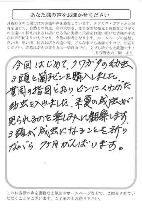 京都府 湯浅 様 生体 X Facebook はてブ LINE Pinterest コピー 2018.11.26 今回はじめて、クワガタの幼虫3頭と菌糸ビンを購入しました。貴園の指図どおり、ビンにくわがた幼虫を入れました。来夏の幼虫が見られるのを楽しみに観察します。3頭が成虫になることを祈りながら、7カ月がんばります。