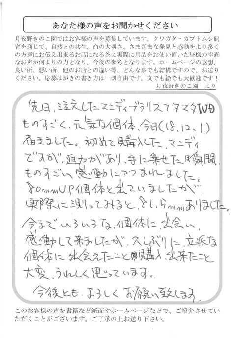 先日、注文したマンディブラリスフタマタWD、ものすごく元気な個体、今日(18.12.1)届きました。初めて購入したマンディですが、迫力があり、手に乗せた瞬間ものすごい感動につつまれました。80㎜UP個体と出ていましたが、実際に測ってみると81.5㎜ありました。今までいろいろな個体に出会い、感動して来ましたが、久しぶりに立派な個体に出会えたこと、購入出来たこと大変、うれしく思っています。今後とも、よろしくお願い致します。