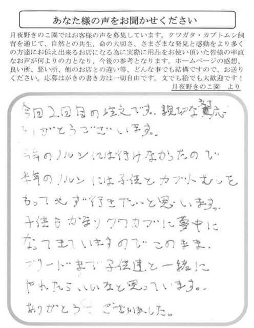 今回2回目に注文です。親切な対応ありがとうございます。今年のノルンには行けなかったので来年のノルンには子供とカブトむしをもって必ず行きたいと思います。子供もかなりクワカブに夢中になってきていますので、このままブリードまで子供達と一緒にやれたらいいなと思っています。ありがとうございました。