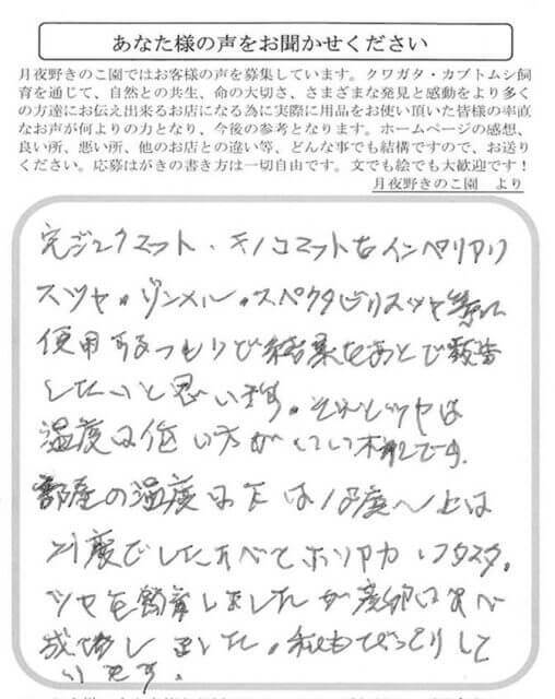 完ジュクマット・キノコマットをインペリアリスツヤ・ゾンメル・スペクタビリスツヤ等に使用するつもりで結果をあとで報告したいと思います。それとツヤは温度は低い方がいい様です。部屋の温度は下は18度~上は21度でしたすべてホソアカ・フタマタ・ツヤを飼育しましたが産卵は成功しました。私もびっくりしています。