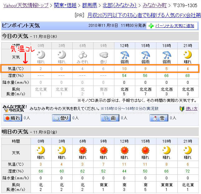 そして次の日、11/18の天気情報は下記のとおりです。