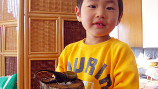約2年ほどで羽化しました。3令後期に菌糸ケースで暴れることが多かったため、マットでの対応し、無事羽化しました。 涼羽と寿が初めて見るクワガタに怖がっておりましたが、何とか写真だけはおさめることができました。