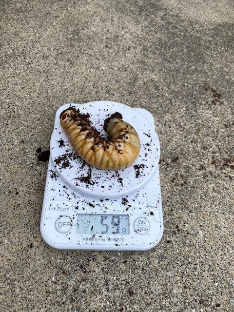 最初は僕の指くらいの小さな幼虫でしたが、きのこマットを使って今では59グラムの大きな幼虫になりました。