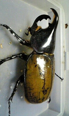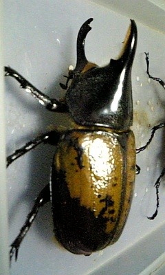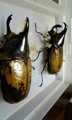 きのこマットで幼虫飼育し12月に♂2頭、♀4頭羽化しました。せっかくバウドリータイプが羽化したと思ったら頭角、胸角の両方が曲がっていました。レイディは、ヘラクレスの亜種の中で一番小さな種類なので角曲がりは出ないと思っていたのでショックでした。曲がらなければ80mmは超えていたので残念です。その後は、人工蛹室で前蛹から羽化させ角曲がり羽化不良共にありませんでした。そして、次の♂は、レイディタイプだったので両方のタイプが羽化したので今回は、良しとし次世代で90mmUpと角曲がり無しに挑戦したいと思います。レイディは、ヘラクレスの亜種の中で一番小さい種類で可愛いし、羽化ずれもしなかったため飼いやすいのでおすすめです。羽化したてで乾かしても羽がまだ完全に黄色くならないのですが投稿してしまいました。ニジイロ、パプキンなどが羽化し産卵セット中とクラビゲールが蛹なのでまた機会があれば投稿します。