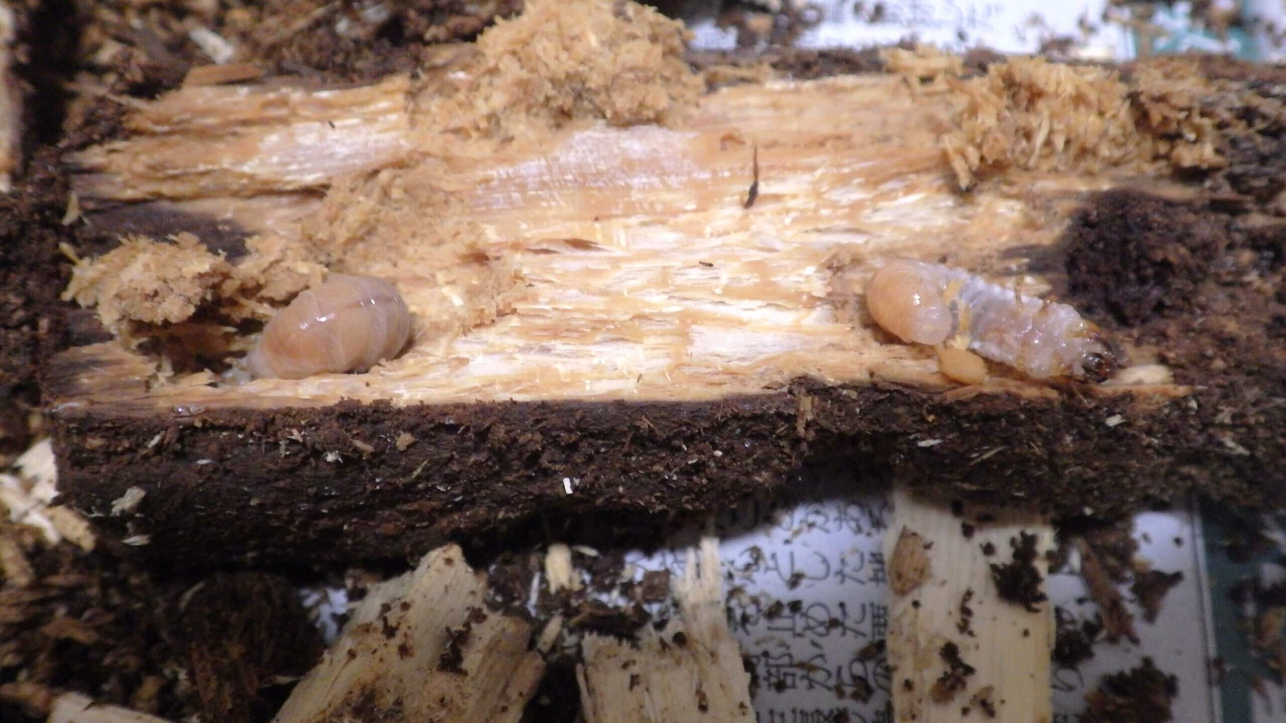 産卵木の内バクテリア材から3齢初期幼虫割出。先に産んでいたようで気に入ったのだろうか?あとは初齢~2齢で、ほとんどが産卵木に。マットからも4頭確認。