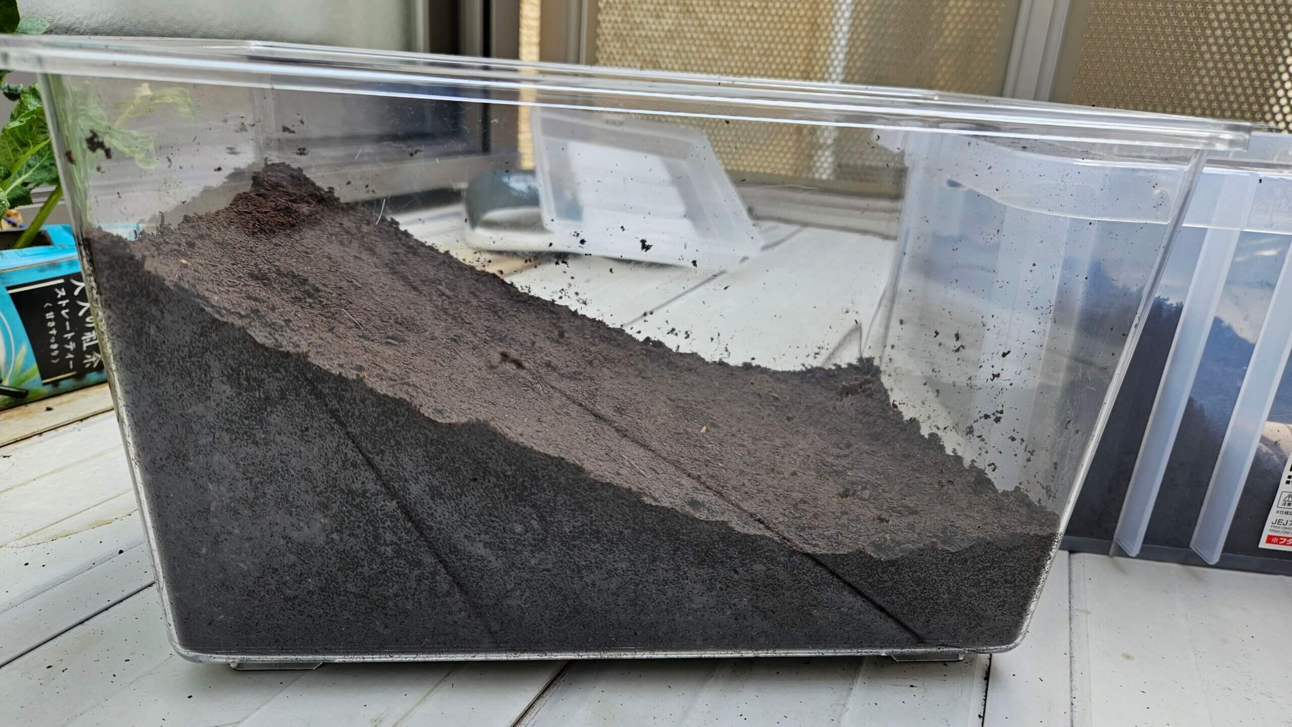 ミヤマクワガタは根食いの虫ということで、木と土の付近の環境を再現するために、硬い部分と柔らかい部分の境界面積を多く作ることを意識した。 温度は高山種なので24時間エアコンで管理し、22度台を保つようにした。