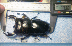 | 飼育期間・状態 | 2007年7月中旬に幼虫9匹を、Basicときのこマットとクヌギの粉砕して混ぜ合わせたものに投入。2008年6月上旬に9匹無事に羽化。全部オス。最大は98ミリ。最小は81ミリ。 |