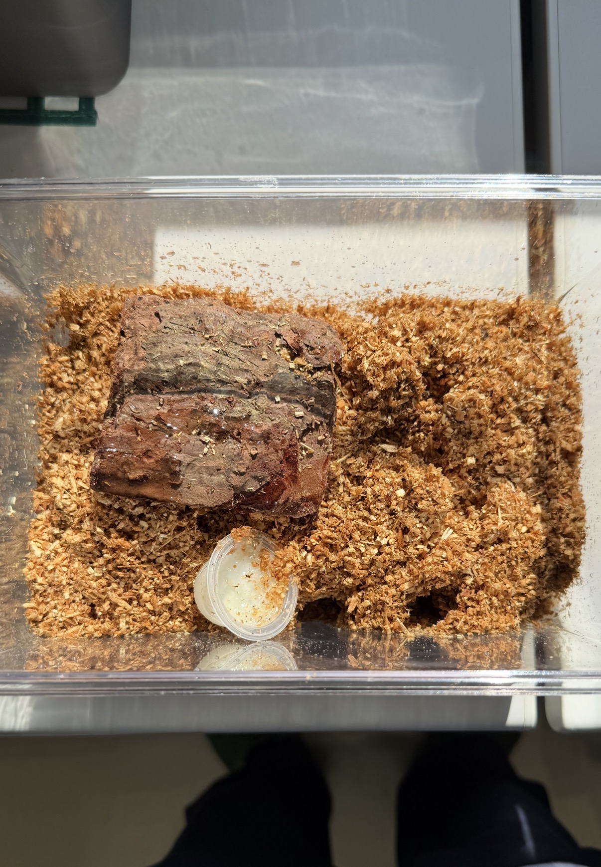 翌日確認すると、いつも以上にバクバク食べた形跡が。その翌日に見ると、いました。約3ヶ月ぶりの再会。(2026,1,1)ノコギリなので、年越しは厳しいと思っていましたが、今も楽しく生きているみたいです。あまり干渉せず、ご飯と水だけを与え、好きに過ごさせています。(23〜26度に保温)