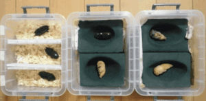 ミミズが出てきたのでマットを代えたら、蛹だった。3000ccはいる100円ショップのプラスチックケースを使用して単独飼育。マットはいろいろミックスして使い、3カ月程度で交換していき、体重は最終的に60gを超えてきました。