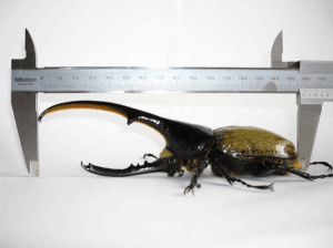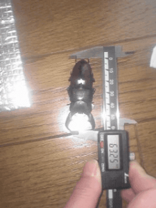 フローレスギラファが羽化してきました。♂110mmです。羽化までの詳細内容は以下のとおりです。<羽化までの内容>使用したエサ:1100㏄PP菌糸ボトル1本+1400ccPP菌糸ボトル1本設定温度:23~25℃前後。エサ交換回数:1回羽化までの期間:約11ヶ月画像上では見づらいかもしれませんが、間違いなく最大110㎜あります。やはりこの位のサイズになると見ごたえがありますね。(^^)
