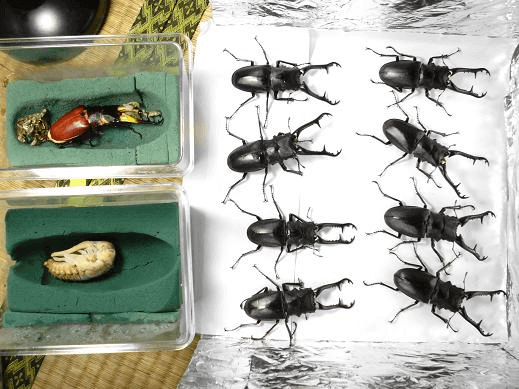 今回は10♂9♀を羽化させました。羽化までの流れは下記の通りです。プリンカップ→700cc~800ccビン→1500cc~2000ccビン10♂サイズの内訳は106mm×1104mm×1103mm×2102mm×1101mm×3100mm×2となります。(平均102mm)♀の平均は約50mmでした。