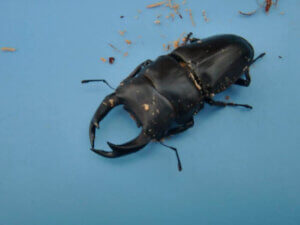 親は2系統。1月に(1)♂27mmx♀22mmより50頭・(2)♂22mmx♀18mmより30頭の幼虫を割り出した。 幼虫は200ccプリンカップを使用してきのこマットにて飼育、温度は、産卵から割り出しまでは「冷やし虫家」を使用し25℃定温管理したが、幼虫は数が多すぎて収容できず、プリンカップを段ボール箱に収容して保温に努め室温管理(古いエアコンで温度がばらついた)で20℃~25℃にて管理。4月30日に、マット交換しようとしたところ、(1)より1頭が既に羽化していたため、交換は中止して、様子を見ていた。 今回は、(1)より17頭(♂14頭、♀3頭)、(2)より11頭(♂5頭、♀6頭)を掘り出し。 親のサイズが遺伝したのか、(1)の個体は何れも大型、(2)の個体は何れも小型だった。